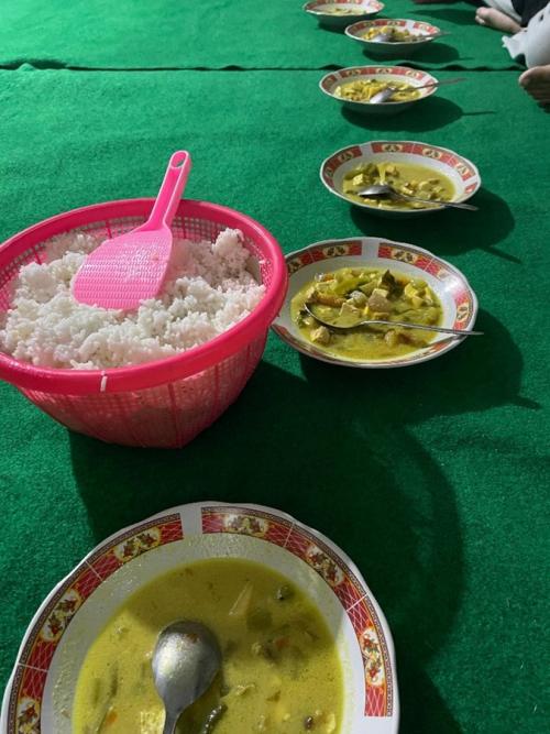 Pengajian akhirnya dimulai, dipimpin oleh sesepuh dusun dan ditutup dengan doa bersama. Begitu selesai, warga langsung bergotong royong menata piring-piring. Sayur hangat dari baskom tadi diaduk-aduk sebelum dituang ke piring, sementara bakul nasi berjejer siap untuk disantap. Kerupuk renyah pun disediakan sebagai pelengkap. Suasana makin hangat ketika semua duduk lesehan, menikmati hidangan bersama di teras masjid yang temaram oleh cahaya lampu. Kebersamaan itu benar-benar terasa menghangatkan di malam 10 Syuro. Saat perut-perut sudah terisi penuh, piring-piring bergesekan ditumpuk rapi, dan tikar-tikar pun dilipat kembali. masyarakat bersalaman dan pamit untuk pulang ke rumah masing-masing.